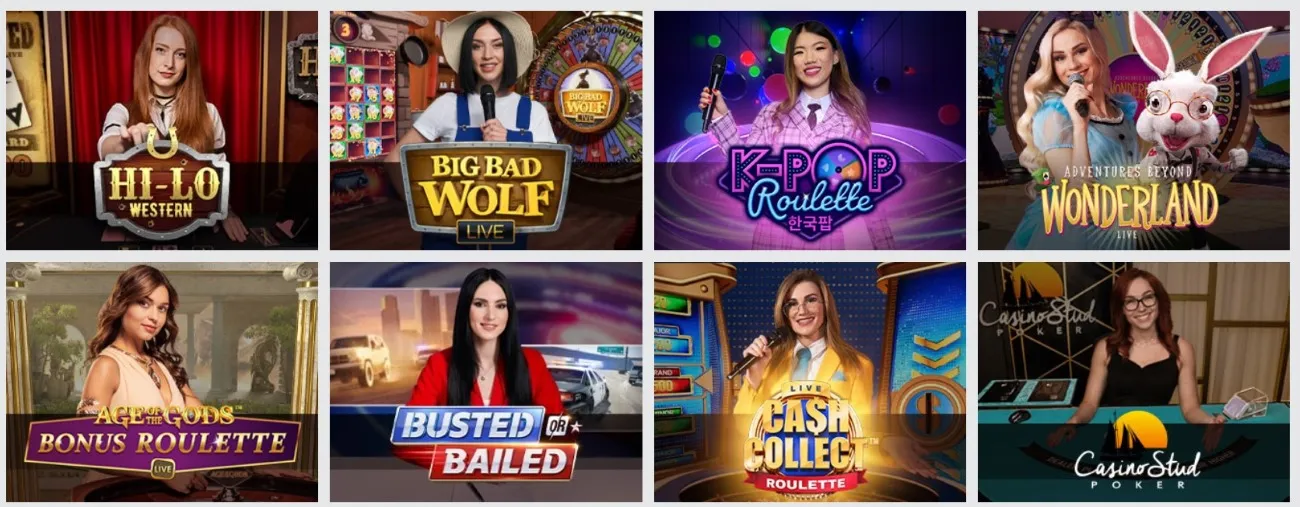 게임은 실제 딜러와 함께 플레이되며 플레이어는 내장된 온라인 채팅을 통해 서로 소통할 수도 있습니다. 이용 가능한 게임은 다음과 같습니다.